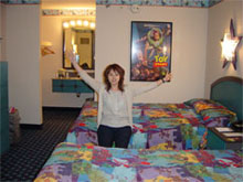 最後に,私たちがお世話になったホテルを紹介します。ホテルは“Disney All Star Movie Resort”という所です。ディズニー色満載で,なおかつリーズナブル,もちろん毎日の移動は送迎バスがあって,良いホテルでした!!また,左下で妻がもっているコップを購入すると(12ドル位),何度でもいくらでもドリンクが勝手に飲み放題という日本ではなかなか考えられないサービスでした☆随分お世話になりました。